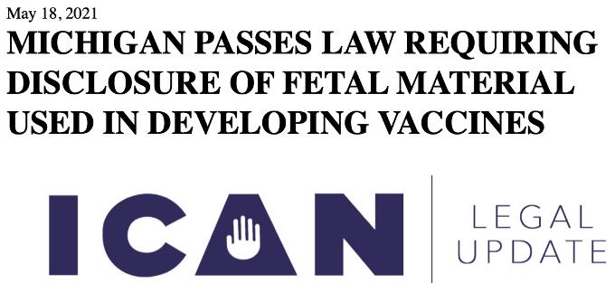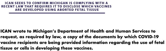 A newly enacted Michigan law requires that: “A recipient of a COVID-19 vaccine … shall be provided with information or informed if and in what manner the development of the vaccine utilized aborted fetal tissue or human embryonic stem cell derivation lines.” ICAN sent a letter to the Michigan Department of Health and Human Services on May 4, 2021 seeking a copy of the document(s) by which COVID-19 vaccine recipients are being provided this information.